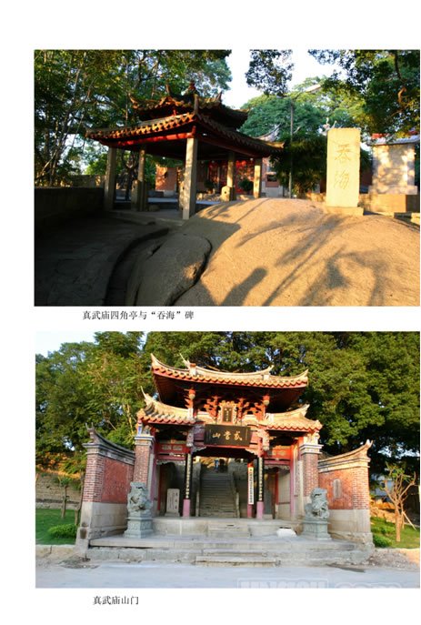 古榕树阴下的真武庙始建于宋代,江海之神真武大帝坐镇其中。山门上悬“武当山”牌匾。石梯上,一块立有“吞石”两字石碑的大石头占据路口,相当气势。庙中竖有一柄七星巨剑,相传为真武大帝所使。庙宇浑浊之时,泉州港一带恶鱼、龟蛇妖魔横生,作恶无数。玉皇大帝派遣真武大帝下凡平妖,真武以太白金星所授的七星剑扫平了妖怪,宇宙豁然开朗,百姓从此安居乐业。。。。。。由于紧邻市区,交通便利,到法石览胜对旅游者而言便是一件舒适惬意的事。